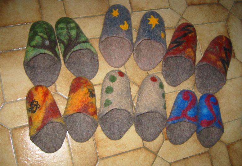 Anti-Rutsch versehen. Es sind natürlich alles Unikate! Die Filzpuschen auf diesem Foto haben die Größen 38 bis 46.